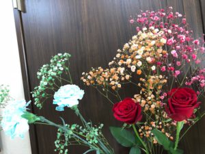 色染めされたかすみ草や、青色のカーネーション、真っ赤なバラ・・・。