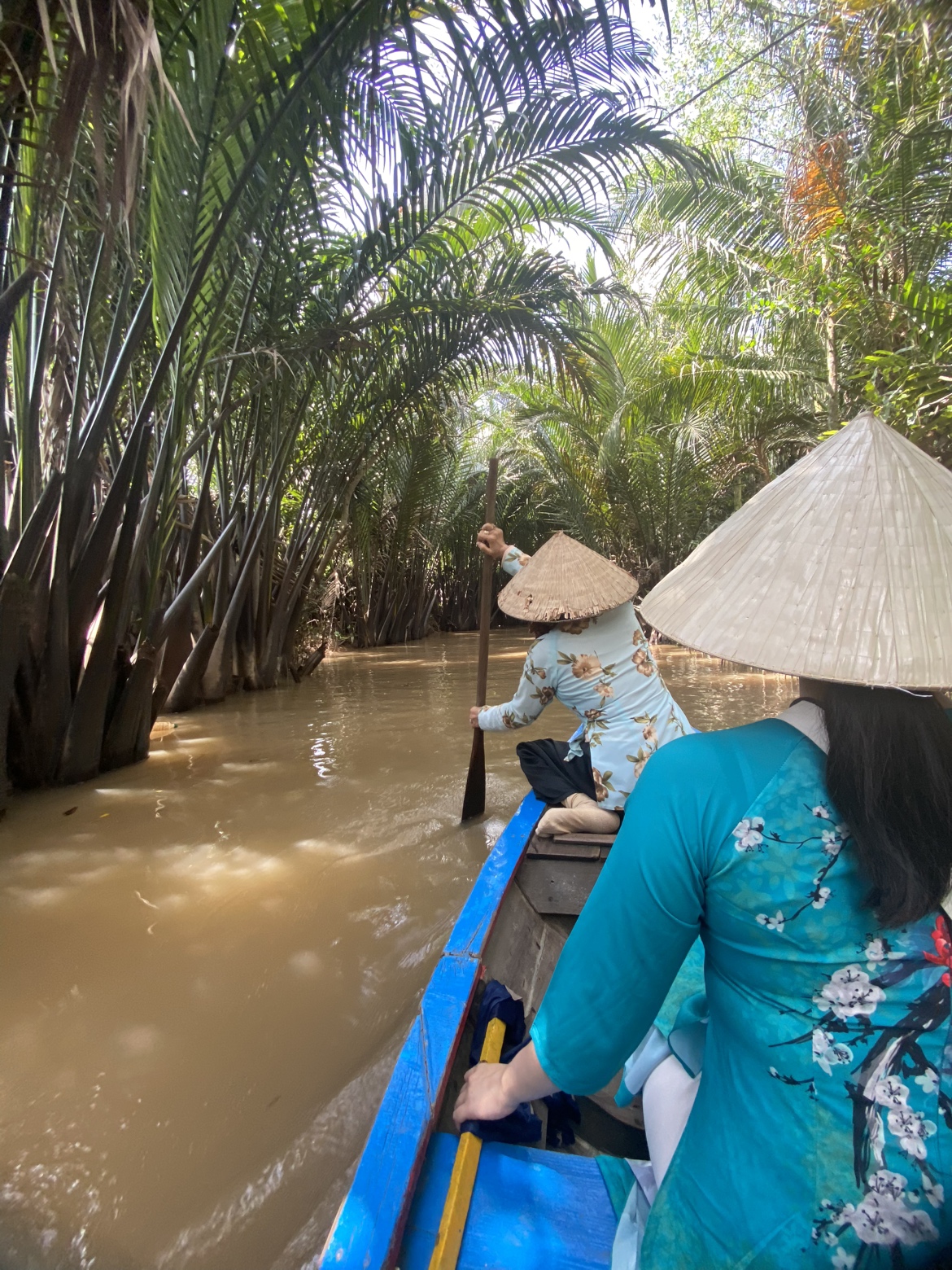 ①民族衣装アオザイを着て、メコン川クルーズ