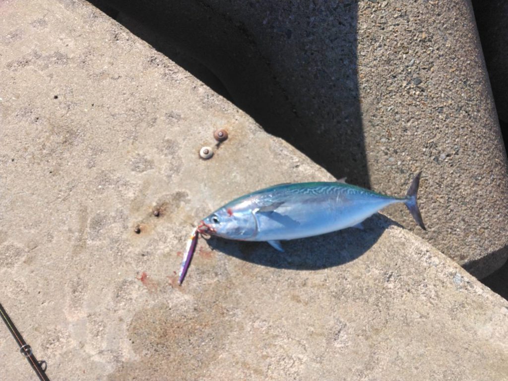 すると何かヒット!良い引きです。釣りあげてみると!カツオ!(ソウダカツオ)