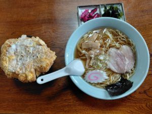 ミニかつ丼と言いながらどんぶりが見えないほどカツがはみ出しています!