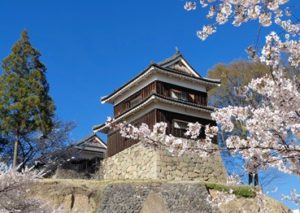透き通る青い空とピンクの桜、そして上田城南櫓、