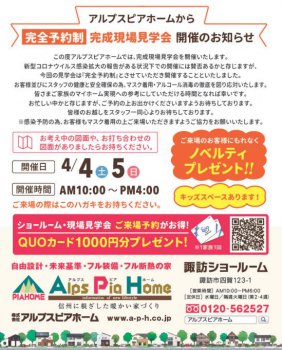 この度アルプスピアホームでは、4/4・5の二日間「完成現場見学会」を開催いたします。