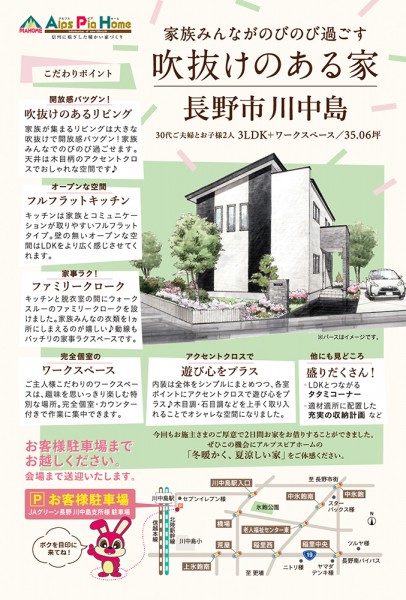備考 | 当日はお客様駐車場へお越しください。会場までご送迎いたします。(JAグリーン長野 川中島支所様 駐車場) また、ご来場の際は事前のご予約をお願いいたします。 |