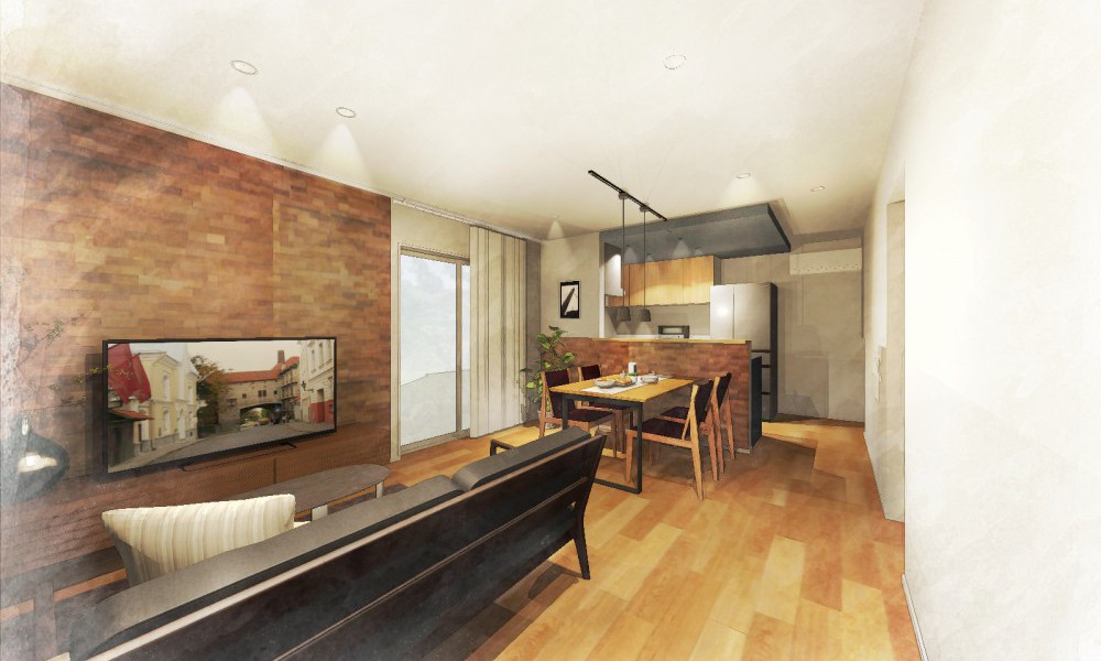 家族が集まるLDKはキッチンから部屋全体が見渡せる安心の空間。リビングのウッドパネルがインテリアのポイント!