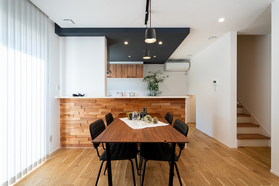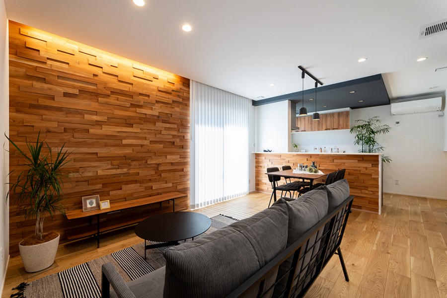 家族が集まるLDKはキッチンから部屋全体が見渡せる安心の空間。リビングのウッドパネルがインテリアのポイント!