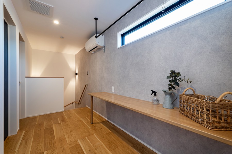 2Fホールのカウンターは、家事スペースとして活躍!洗濯物が干せるアイアンバーを設置。カウンターはPC作業や学習机としても活用できます◎