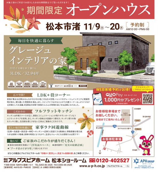 11/9(木)~20(月) 松本市渚にてオープンハウスを開催!