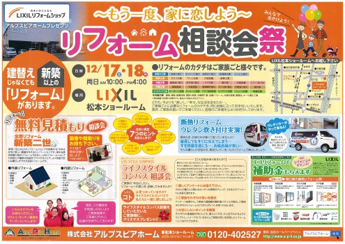 12/17(土)・18(日)の2日間!AM10:00~PM4:00まで、【LIXIL】松本ショールームにて、「リフォーム相談会祭」を開催いたします♪