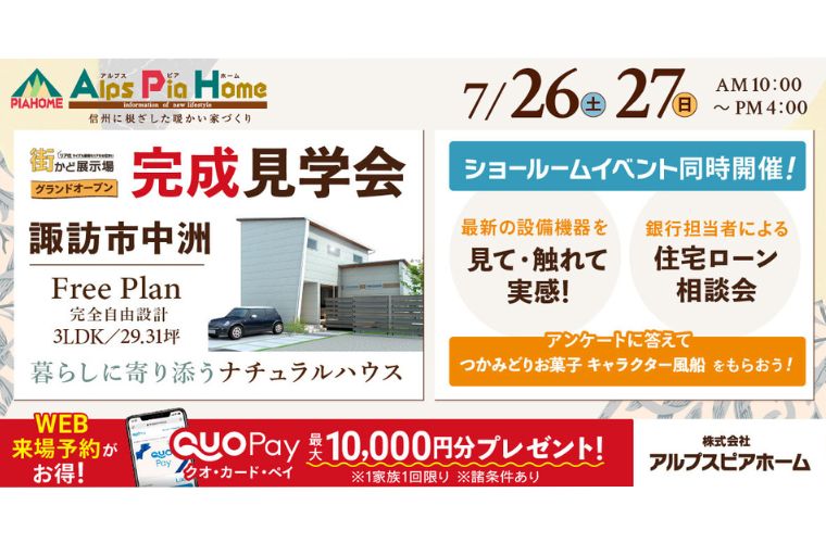 7/26(土)・27(日)完成現場見学会&諏訪ショールームイベントを開催します!