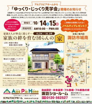 10/14(土)・15(日)の2日間、【諏訪市城南】にて、新築完成現場見学会を開催いたします。