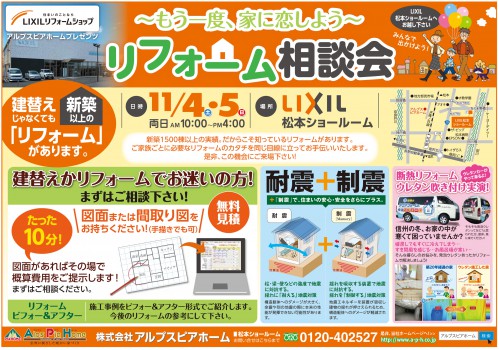 AM10:00~PM4:00まで、【LIXIL】松本ショールームにて、「リフォーム相談会祭」を開催いたします♪