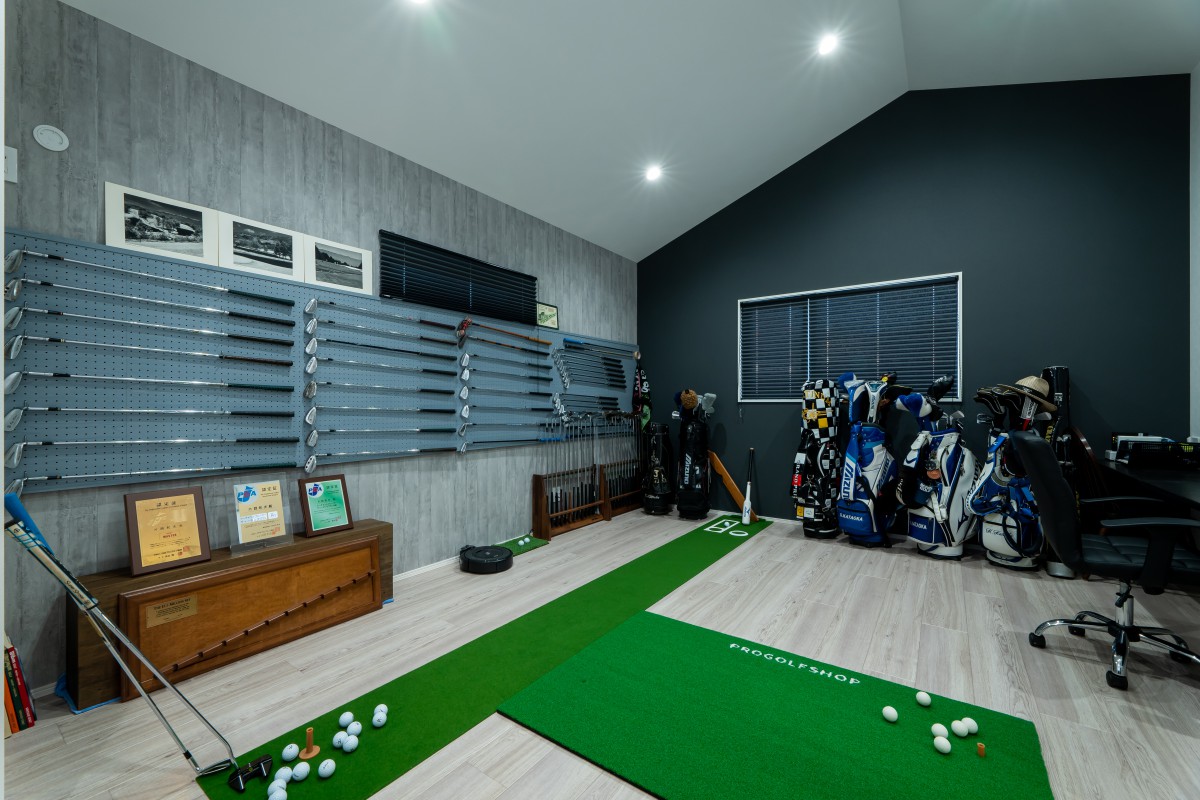 思いきりクラブが振れる、広さ約11帖・天井高約3mのゴルフの部屋