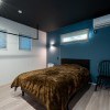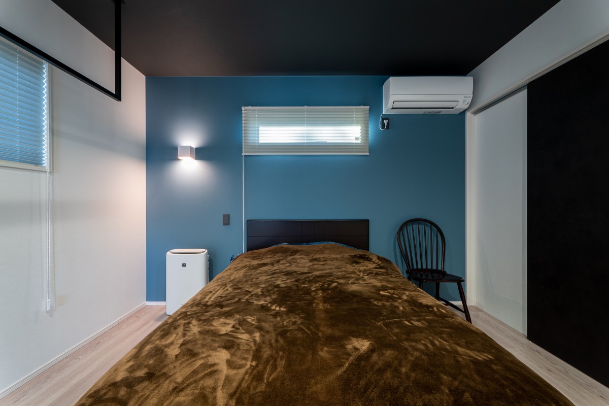 黒い天井が印象的な寝室は、間接照明が効果的で、ブラックアイアンのバーが実用にもアクセントにもなる