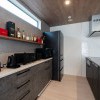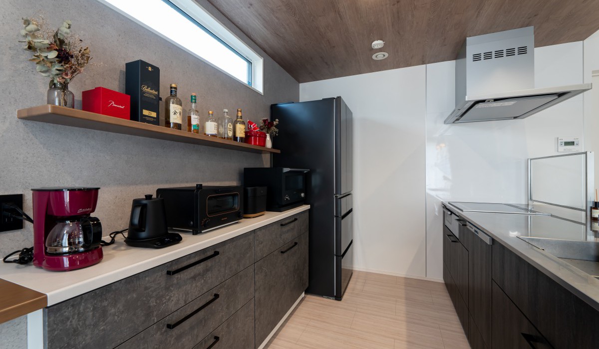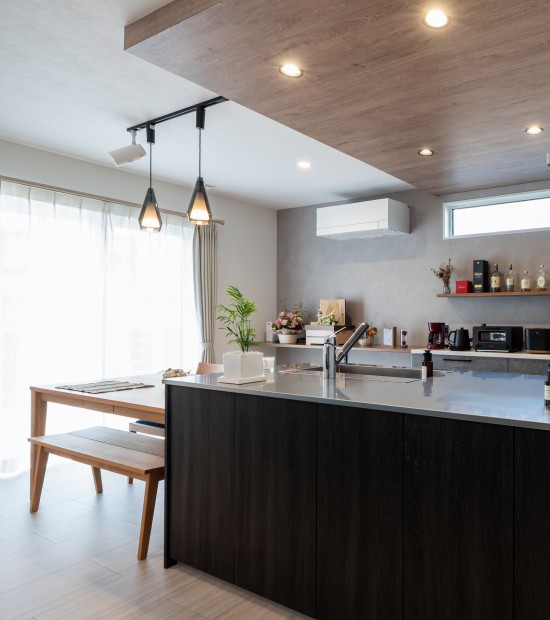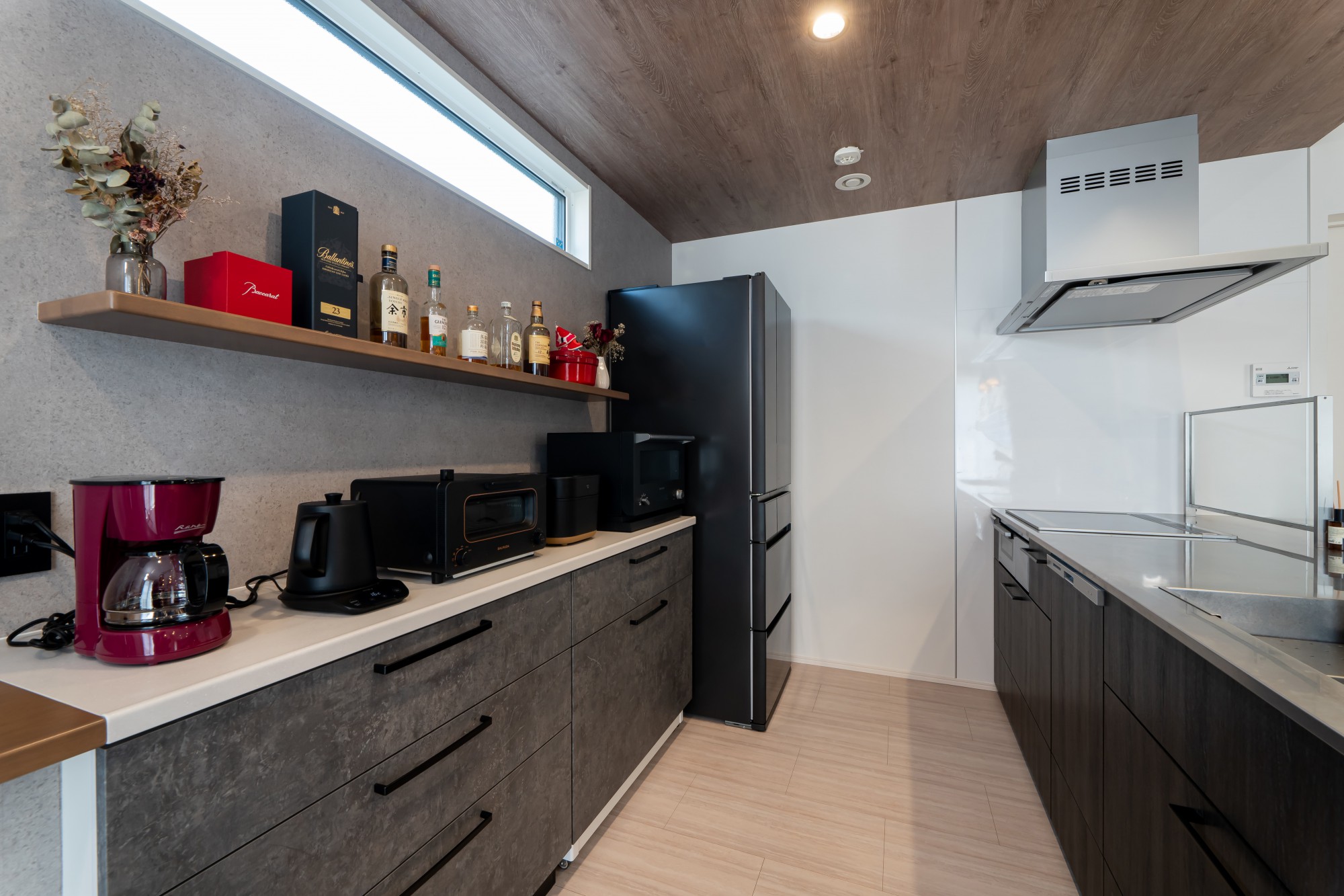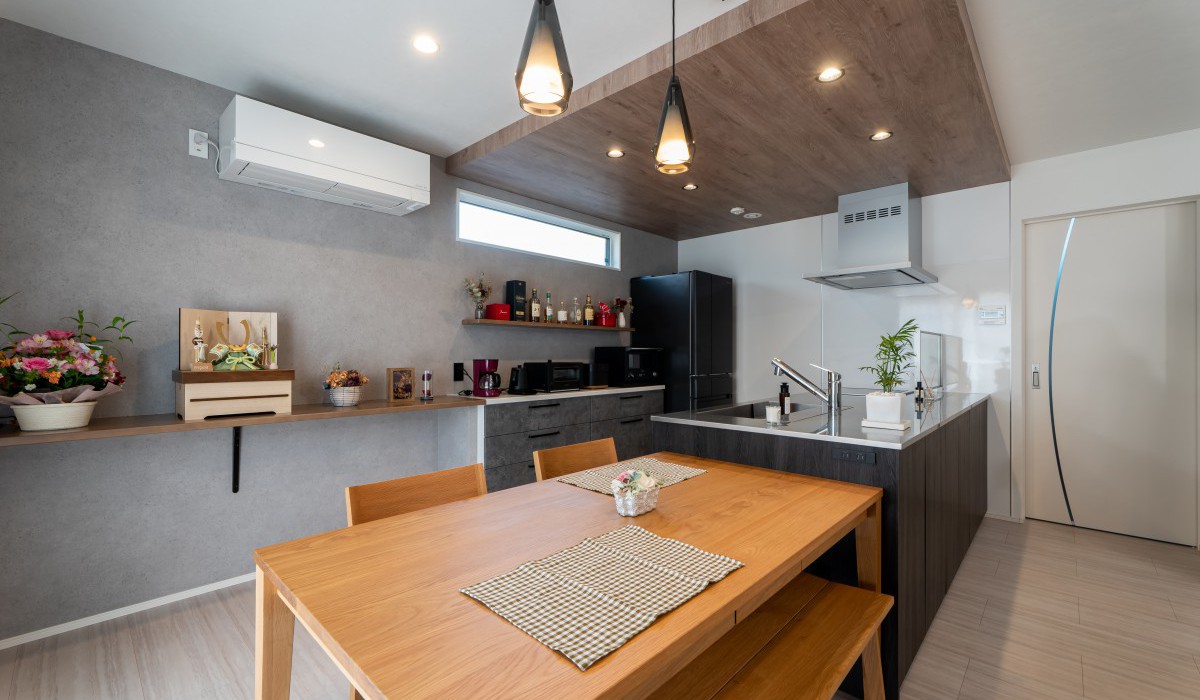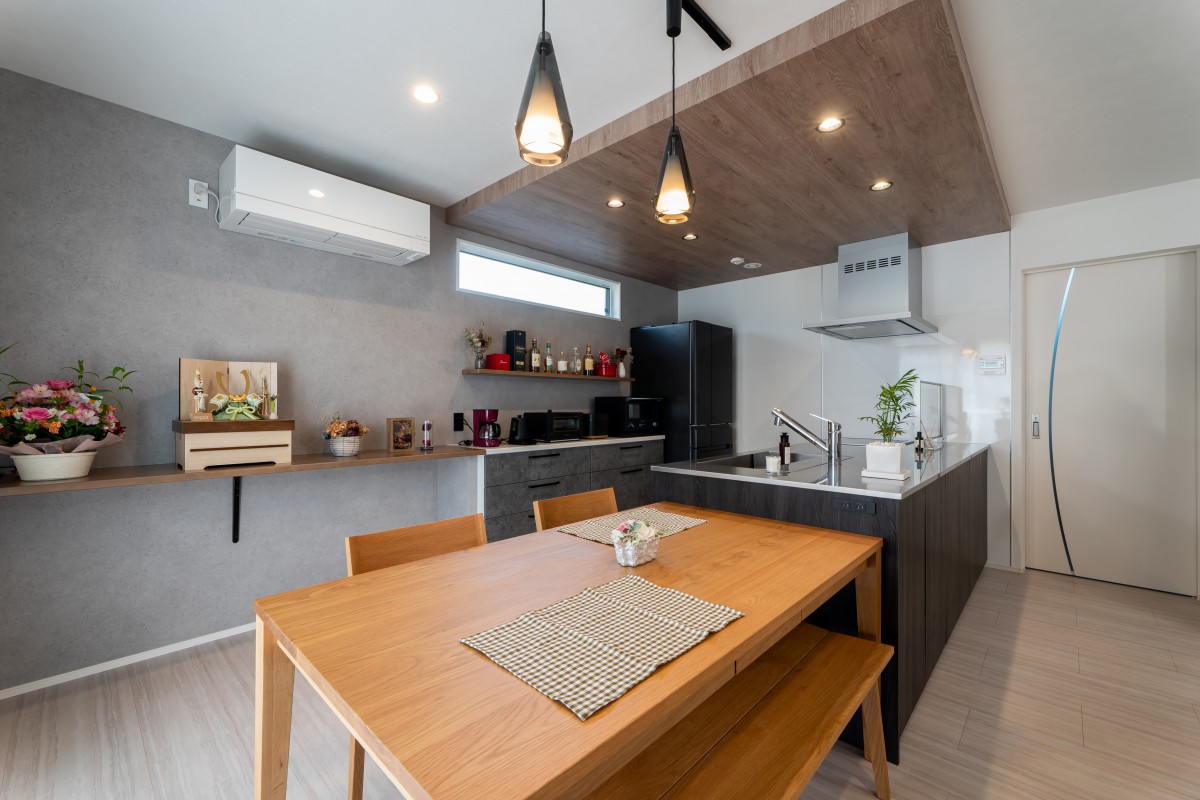 家電類を並べる棚と作業台も兼ねたカウンターを一直線にすることで、余計な水平ラインがなくスッキリと見える効果が。カラーも濃淡のグレー系と木目に絞り、長く使っても飽きのこないシンプルな空間に仕上がりました。