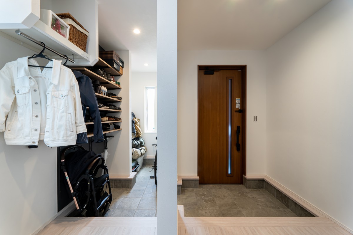 「見せる収納」を意識したというシューズクローク。DIYで棚が付けられるように、壁の施工に工夫がされています