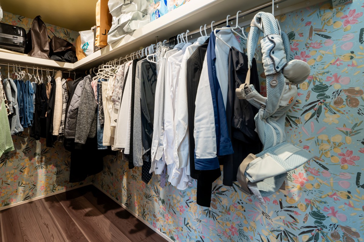シックなT様邸の中でガラリと雰囲気の違うクローゼットは、完成後の見学会でも好評。大胆な壁紙選びができるのもこの空間だから