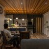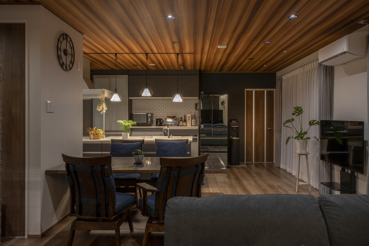 化粧梁と照明、エッジの効いたクロスが彩りを添え、インテリア雑貨にセンスを感じるリビング。システムキッチンはパンを焼くのが趣味の奥様チョイスのトクラス。熱や衝撃に強い人造大理石カウンターもお気に入り。