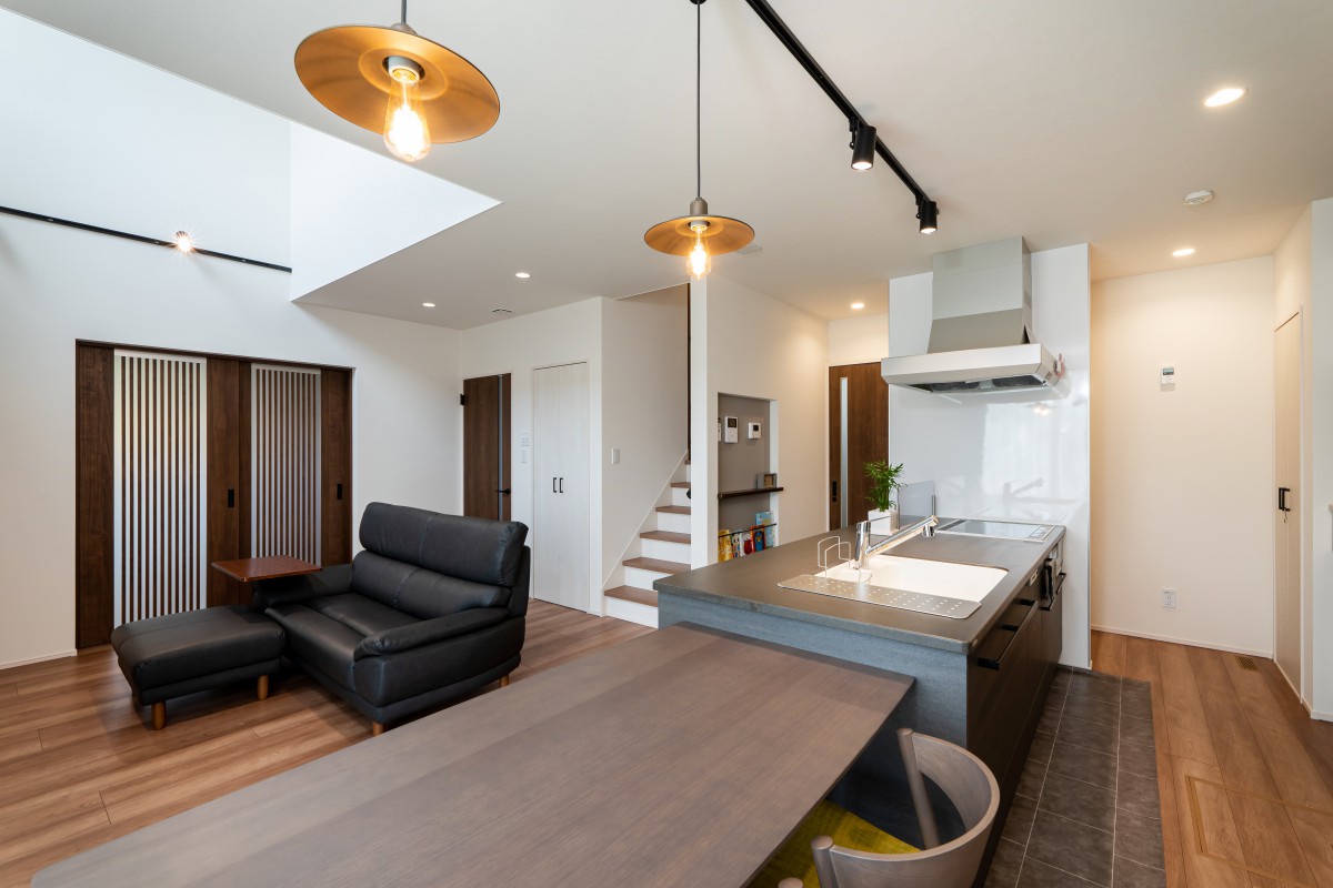 とにかく広さと明るさにこだわったという吹き抜けのあるリビングは、どんなに悪天候でも昼間は照明いらず。キッチンは、将来おじいちゃんおばあちゃんになっても似合うようにと、シンプルで落ち着いた雰囲気に。